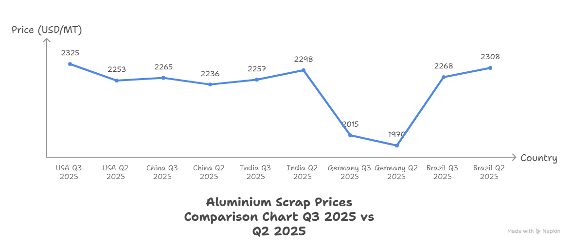 In Q3 2025, Aluminium Scrap Prices displayed steady variations influenced by regional recycling activity and demand from automotive, manufacturing, and construction sectors. The USA rose to USD 2325/MT, reflecting stronger downstream consumption. China reached USD 2265/MT, supported by active industrial recycling. India stood at USD 2257/MT, while Germany recorded a lower USD 2015/MT due to softer industrial output. Brazil maintained competitive pricing at USD 2268/MT, indicating balanced domestic supply.