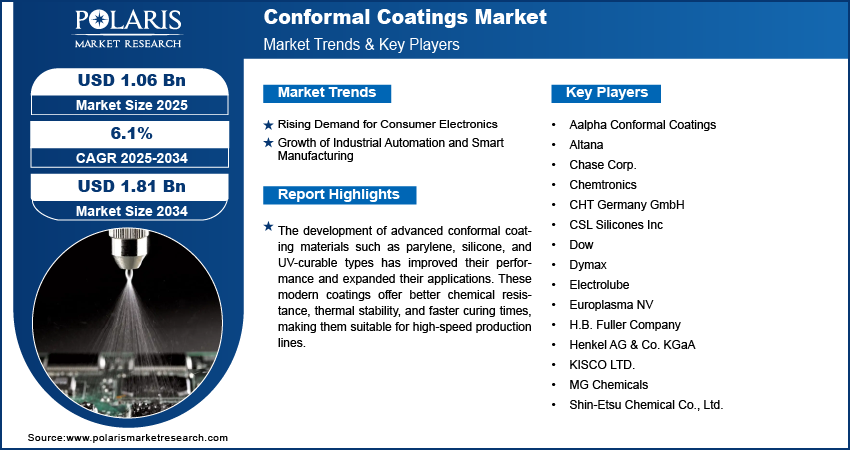 The latest market study published by Polaris Market Research titled Conformal Coatings Market Size, Share, Trends, & Industry Analysis Report By Material (Acrylic, Epoxy), By Application, and By Region – Market Forecast, 2025–2034 is designed to provide users with an in-depth understanding of the market. A comprehensive historical analysis of the market is given, along with extensive market forecasts by region/country and subsectors. The primary objective of this report is to help readers gain insights into Conformal Coatings Market size, trends, sales volume, revenue, historical growth, latest developments, and future outlooks. It offers a qualitative and quantitative analysis of leading participants, expansion plans, geographical regions, and share valuations across all regions.