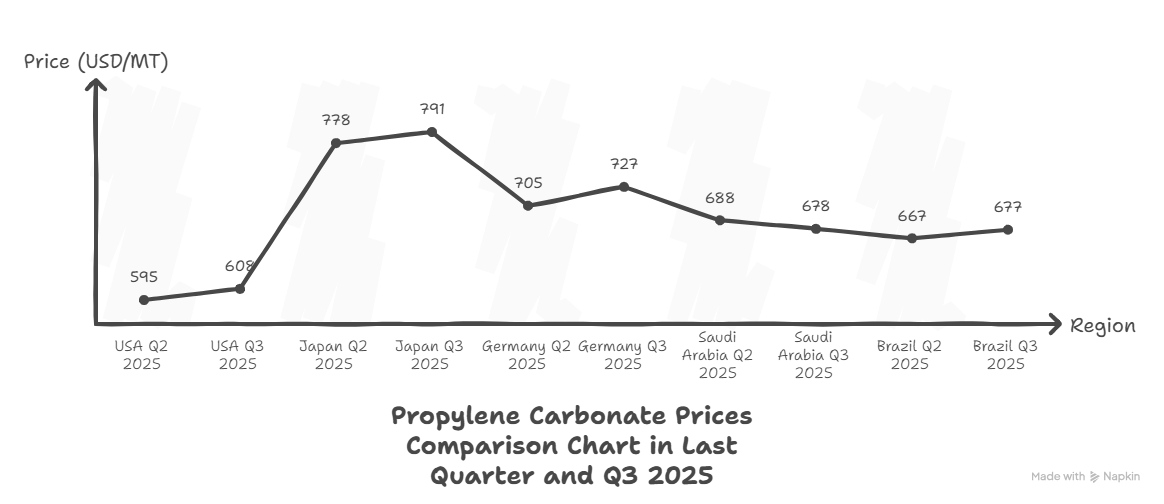 In Germany, propylene carbonate prices stood at USD 727/MT, reflecting steady usage across pharmaceutical and high-performance solvent industries. Meanwhile, Saudi Arabia registered prices of USD 678/MT, supported by cost-efficient feedstock access and stable production output. In Brazil, prices closed the quarter at USD 677/MT, indicating balanced demand conditions and controlled supply flows.