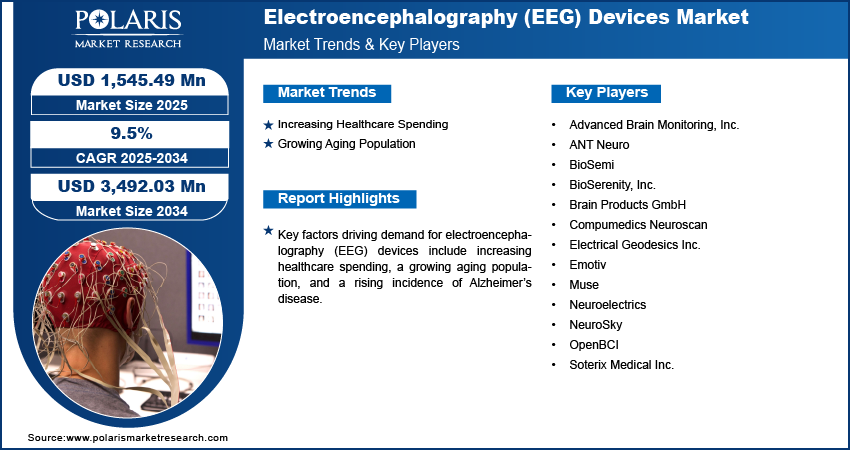 Ans: The global EEG devices market was valued at USD 1,414.25 million in 2024 and is expected to reach USD 3,492.03 million by 2034.