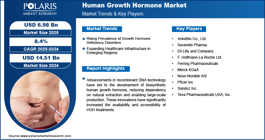 The latest market study published by Polaris Market Research titled Human Growth Hormone Market Size, Share, Trends, & Industry Analysis Report By Type (Long-acting, Short-acting & Intermediate-acting), By Route of Administration, By Age, By Disease, By Distribution Channel, and By Region – Market Forecast, 2025–2034 is designed to provide users with an in-depth understanding of the market. A comprehensive historical analysis of the market is given, along with extensive market forecasts by region/country and subsectors.