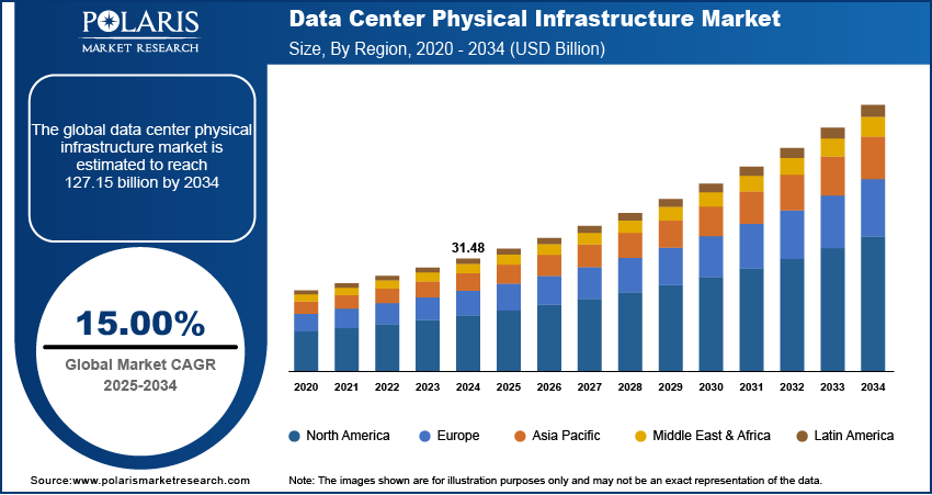 The global data center physical infrastructure market was valued at USD 31.48 billion in 2024 and is projected to grow at a CAGR of 15.0% from 2025 to 2034, reaching USD 127.15 billion by 2034.