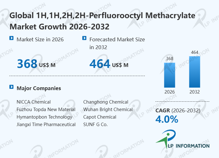 The global 1H,1H,2H,2H-Perfluorooctyl Methacrylate market size is predicted to grow from US$ 355 million in 2025 to US$ 464 million in 2032; it is expected to grow at a CAGR of 4.0% from 2026 to 2032.