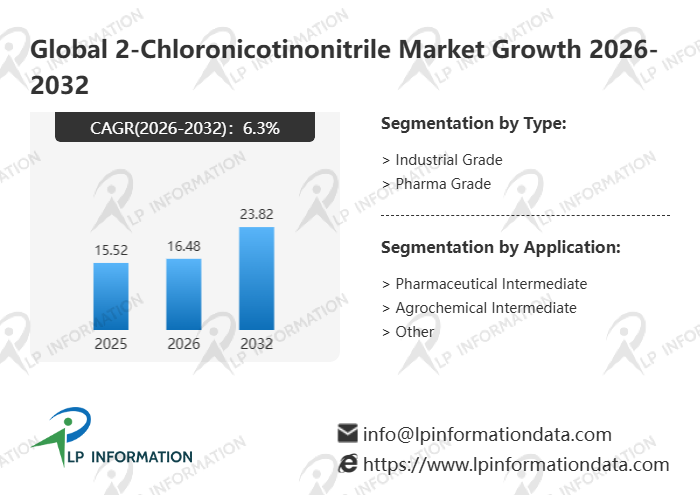 The global 2-Chloronicotinonitrile market size is predicted to grow from US$ 15.52 million in 2025 to US$ 23.82 million in 2032; it is expected to grow at a CAGR of 6.3% from 2026 to 2032.