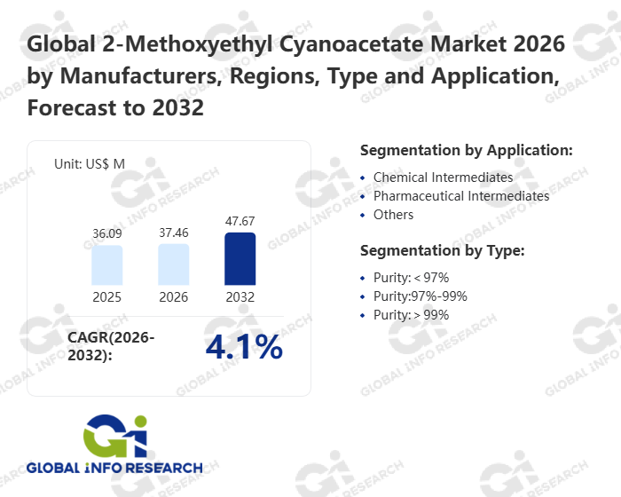 Global Info Research has recently published "Global 2-Methoxyethyl Cyanoacetate Market 2026 by Manufacturers, Regions, Type and Application, Forecast to 2032". This report systematically analyzes the global 2-Methoxyethyl Cyanoacetate market, providing multi-dimensional insights through type (Purity:<97%、 Purity:97%-99%、 Purity:>99%), application (Chemical Intermediates、 Pharmaceutical Intermediates、 Others), regional markets, and major manufacturers (Dayang Chem、 Leap Chem Co., Ltd、 COMBI-BLOCKS、 Hebei Yanxi Chemical Co. LTD.、 Career Henan Chemical Co.、 Conier Group、 Simagchem、 Hefei TNJ Chemical Industry Co.,Ltd.、 Henan Alfa Chemical Co., Ltd、 Huayang Technology Co., Ltd.、 Changzhou Ansciep Chemical Co.,Ltd.、 J&K Scientific Ltd.), assessing the market status, trend evolution, and competitive landscape impact from 2021 to 2032.