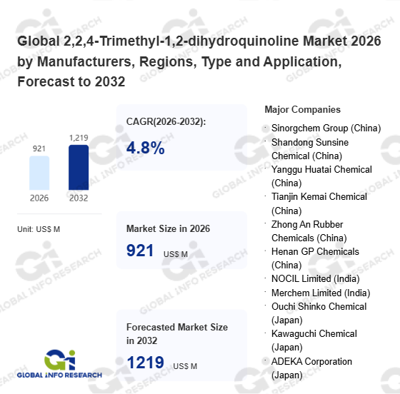 Global Info Research has recently published "Global 2,2,4-Trimethyl-1,2-dihydroquinoline Market 2026 by Manufacturers, Regions, Type and Application, Forecast to 2032". This report systematically analyzes the current status, future trends (2021-2032), and competitive landscape of the global 2,2,4-Trimethyl-1,2-dihydroquinoline market. It provides a quantitative analysis from the perspectives of type (Monomeric TMQ、 Oligomeric TMQ), application (Automotive、 Industrial、 Construction、 Footwear、 Others), regional markets, and major manufacturers (Sinorgchem Group (China)、 Shandong Sunsine Chemical (China)、 Yanggu Huatai Chemical (China)、 Tianjin Kemai Chemical (China)、 Zhong An Rubber Chemicals (China)、 Henan GP Chemicals (China)、 NOCIL Limited (India)、 Merchem Limited (India)、 Ouchi Shinko Chemical (Japan)、 Kawaguchi Chemical (Japan)、 ADEKA Corporation (Japan)、 Kumho Petrochemical (South Korea)、 LANXESS (Germany)、 Eastman Chemical (USA)、 SI Group (USA)、 Agrofert Group (Slovakia)), comprehensively assessing market opportunities and competitive dynamics.