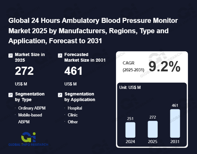 Global Info Research has recently published "Global 24 Hours Ambulatory Blood Pressure Monitor Market 2026 by Manufacturers, Regions, Type and Application, Forecast to 2032". This report systematically analyzes the current status, future trends (2021-2032), and competitive landscape of the global 24 Hours Ambulatory Blood Pressure Monitor market. It provides a quantitative analysis from the perspectives of type (Ordinary ABPM、 Mobile-based ABPM), application (Hospital、 Clinic、 Other), regional markets, and major manufacturers (Hill-Rom、 SunTech Medical、 A&D、 Spacelabs Healthcare、 Schiller、 Bosch + Sohn、 Microlife、 Vasomedical、 Meditech、 Riester、 Mindray、 Suzuken、 HINGMED), comprehensively assessing market opportunities and competitive dynamics.