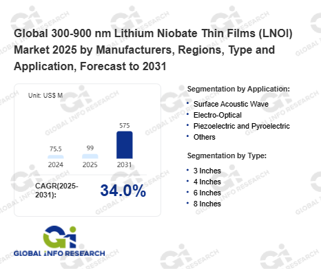 Global Info Research has recently published "Global 300-900 nm Lithium Niobate Thin Films (LNOI) Market 2026 by Manufacturers, Regions, Type and Application, Forecast to 2032". This report systematically analyzes the global 300-900 nm Lithium Niobate Thin Films (LNOI) market, providing multi-dimensional insights through type (3 Inches、 4 Inches、 6 Inches、 8 Inches), application (Surface Acoustic Wave、 Electro-Optical、 Piezoelectric and Pyroelectric、 Others), regional markets, and major manufacturers (Jinan Jingzheng Electronics (NANOLN)、 Shanghai Novel Si Integration Technology、 NGK Insulators、 PAM Xiamen、 Partow Technologies、 Alfa Chemistry), assessing the market status, trend evolution, and competitive landscape impact from 2021 to 2032.
