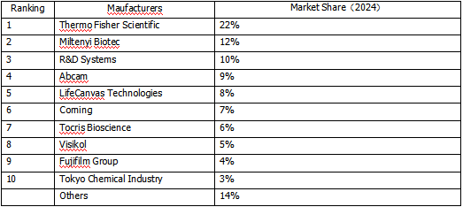 According to Global Info Research Top Players Research Center, the global key manufacturers of 3D Cell Culture Clearing Reagent include Thermo Fisher Scientific, Miltenyi Biotec, R&D Systems, Abcam, etc. In 2024, the global top four players had a share approximately 53.0% in terms of revenue.