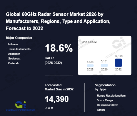 Global Info Research has recently published "Global 60GHz Radar Sensor Market 2026 by Manufacturers, Regions, Type and Application, Forecast to 2032". This report systematically analyzes the global 60GHz Radar Sensor market, providing multi-dimensional insights through type (Range Resolution≤5cm、 5cm<Range Resolution≤10cm、 Others), application (Automotive、 Smart Home、 Healthcare、 Others), regional markets, and major manufacturers (Infineon、 Texas Instruments、 Acconeer、 Socionext、 Calterah), assessing the market status, trend evolution, and competitive landscape impact from 2021 to 2032.