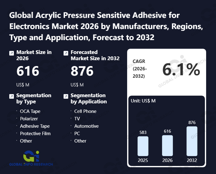 Global Info Research has recently published "Global Acrylic Pressure Sensitive Adhesive for Electronics Market 2026 by Manufacturers, Regions, Type and Application, Forecast to 2032". This report systematically analyzes the global Acrylic Pressure Sensitive Adhesive for Electronics market, providing multi-dimensional insights through type (OCA Tape、 Polarizer、 Adhesive Tape、 Protective Film、 Other), application (Cell Phone、 TV、 Automotive、 PC、 Other), regional markets, and major manufacturers (3M、 Henkel、 tesa SE、 Nitto Denko、 Akema、 Fuller、 Soken、 Avery Dennison、 Mitsubishi Chemical、 Crown Adhesive Products、 Fuyin Group、 FKTAPE、 Jiangsu Sidike), assessing the market status, trend evolution, and competitive landscape impact from 2021 to 2032.