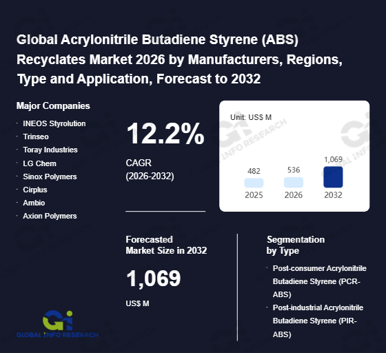 Global Info Research has recently published "Global Acrylonitrile Butadiene Styrene (ABS) Recyclates Market 2026 by Manufacturers, Regions, Type and Application, Forecast to 2032". This report systematically analyzes the global Acrylonitrile Butadiene Styrene (ABS) Recyclates market, providing multi-dimensional insights through type (Post-consumer Acrylonitrile Butadiene Styrene (PCR-ABS)、 Post-industrial Acrylonitrile Butadiene Styrene (PIR-ABS)), application (Automotive Part、 Electronics & Electrical Appliances、 FMCG、 Medical Devices、 Building Materials、 Others), regional markets, and major manufacturers (INEOS Styrolution、 Trinseo、 Toray Industries、 LG Chem、 Sinox Polymers、 Cirplus、 Ambio、 Axion Polymers、 SRI、 Polykemi AB、 ELIX Polymers、 EMR Group、 CHIMEI Corporation、 Tong Li Plastics、 HorngEn Plastic、 Global Green Material、 Guo Su Plastic Industry、 Ecoplas (HK)、 Mission Recyco New Materials (Jiangsu)、 Veolia Huafei Polymer Technology (Zhejiang)、 Anhui Guanhong Plastic Industry、 Shunde Tongtai Plastic、 Huizhou Sanyu Carbon Reduction Recycle Material、 Hunan Hengsu New Material Technology、 Ningbo Topcentral), assessing the market status, trend evolution, and competitive landscape impact from 2021 to 2032.