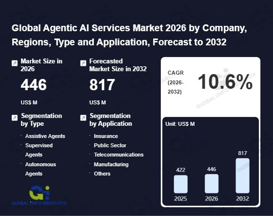 Global Info Research has recently published "Global Agentic AI Services Market 2026 by Manufacturers, Regions, Type and Application, Forecast to 2032". This report systematically analyzes the global Agentic AI Services market, providing multi-dimensional insights through type (Assistive Agents、 Supervised Agents、 Autonomous Agents), application (Insurance、 Public Sector、 Telecommunications、 Manufacturing、 Others), regional markets, and major manufacturers (Microsoft、 Salesforce、 ServiceNow、 UiPath、 Automation Anywhere、 SS&C Blue Prism、 Sana Labs、 Celonis、 Naviant、 Beam AI), assessing the market status, trend evolution, and competitive landscape impact from 2021 to 2032.