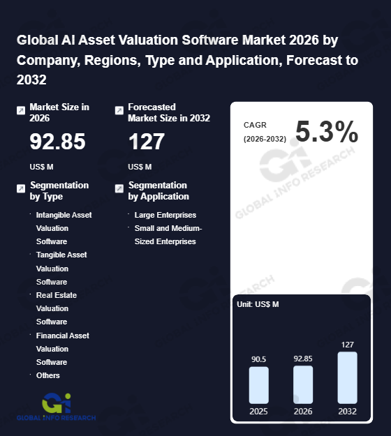 Global Info Research has recently published "Global AI Asset Valuation Software Market 2026 by Manufacturers, Regions, Type and Application, Forecast to 2032". This report systematically analyzes the global AI Asset Valuation Software market, providing multi-dimensional insights through type (Intangible Asset Valuation Software、 Tangible Asset Valuation Software、 Real Estate Valuation Software、 Financial Asset Valuation Software、 Others), application (Large Enterprises、 Small and Medium-Sized Enterprises), regional markets, and major manufacturers (73 Strings、 Allvue Systems、 Axyon AI、 C3 AI、 Comparables、 Cyndx、 PriceHubble、 PrometAI、 Sana Labs、 SotaTek、 V7 Go、 Valos、 Valtech、 Valuebase、 Valutico), assessing the market status, trend evolution, and competitive landscape impact from 2021 to 2032.