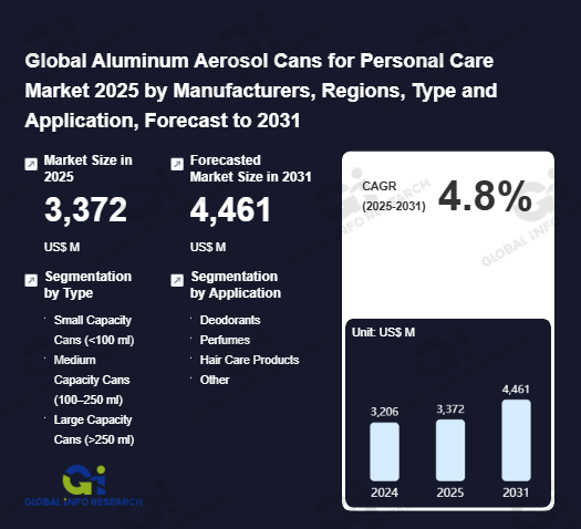 Global Info Research has recently published "Global Aluminum Aerosol Cans for Personal Care Market 2026 by Manufacturers, Regions, Type and Application, Forecast to 2032". This report systematically analyzes the global Aluminum Aerosol Cans for Personal Care market, providing multi-dimensional insights through type (Small Capacity Cans (<100 ml)、 Medium Capacity Cans (100–250 ml)、 Large Capacity Cans (>250 ml)), application (Deodorants、 Perfumes、 Hair Care Products、 Other), regional markets, and major manufacturers (Ball、 CCL Container、 ALLTUB、 Alucon、 Trivium Packaging、 TUBEX GmbH、 Tecnocap Group、 Aryum、 Bispharma、 Montebello Packaging、 Impacta SA、 Bharat Containers、 Linhardt Group、 Condensa、 Casablanca Industries、 Jamestrong Packaging、 Nussbaum Group、 Nampak、 Perfektüp、 Takeuchi Press Industries、 Printal Oy、 PT New Red & White Manufactory、 Euro Asia Packaging、 Shantou Oriental Technology、 Shanghai Jiatian Pharmaceutical Packaging), assessing the market status, trend evolution, and competitive landscape impact from 2021 to 2032.