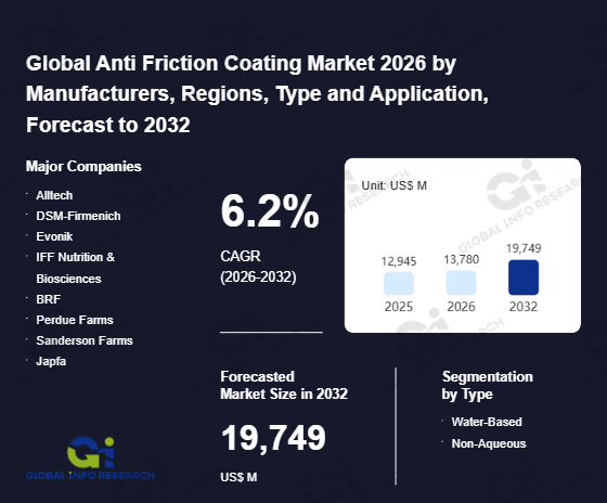 Global Info Research has recently published "Global Anti Friction Coating Market 2026 by Manufacturers, Regions, Type and Application, Forecast to 2032". This report systematically analyzes the global Anti Friction Coating market, providing multi-dimensional insights through type (Water-Based、 Non-Aqueous), application (Automotive Components、 Industrial Machinery、 Aerospace & Defense、 Energy Equipment), regional markets, and major manufacturers (Alltech、 DSM-Firmenich、 Evonik、 IFF Nutrition & Biosciences、 BRF、 Perdue Farms、 Sanderson Farms、 Japfa、 De Heus、 Skretting、 BioMar、 Mowi Feed、 Charoen Pokphand Group、 Muyuan Foods、 Wens Foodstuff、 East Hope Group、 COFCO), assessing the market status, trend evolution, and competitive landscape impact from 2021 to 2032.