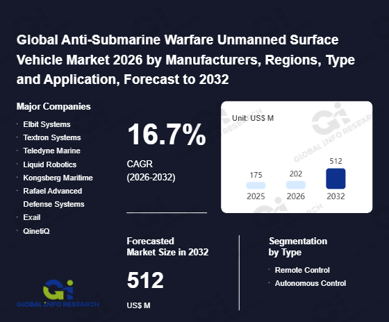Global Info Research has recently published "Global Anti-Submarine Warfare Unmanned Surface Vehicle Market 2026 by Manufacturers, Regions, Type and Application, Forecast to 2032". This report systematically analyzes the current status, future trends (2021-2032), and competitive landscape of the global Anti-Submarine Warfare Unmanned Surface Vehicle market. It provides a quantitative analysis from the perspectives of type (Remote Control、 Autonomous Control), application (Military、 Civilian), regional markets, and major manufacturers (Elbit Systems、 Textron Systems、 Teledyne Marine、 Liquid Robotics、 Kongsberg Maritime、 Rafael Advanced Defense Systems、 Exail、 QinetiQ、 EvoLogics、 SeaRobotics、 L3Harris、 Saildrone、 Hanwha Systems、 BlueZone Group、 OCIUS Technology), comprehensively assessing market opportunities and competitive dynamics.