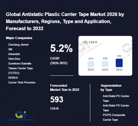 Global Info Research has recently published "Global Antistatic Plastic Carrier Tape Market 2026 by Manufacturers, Regions, Type and Application, Forecast to 2032". This report systematically analyzes the global Antistatic Plastic Carrier Tape market, providing multi-dimensional insights through type (Anti-Static PC Carrier Tape、 Anti-Static PS Carrier Tape、 PC/PS Composite Carrier Tape), application (Active Components、 Passive Components), regional markets, and major manufacturers (ZheJiang Jiemei、 3M、 Advantek、 Shin-Etsu、 Sumitomo Bakelite、 Taiwan Carrier Tape (TCTEC)、 DENKA、 Carrier Tech Precision、 Lasertek、 HWA SHU、 C-Pak、 Asahi Kasei、 Tek Pack、 Nihon Matai), assessing the market status, trend evolution, and competitive landscape impact from 2021 to 2032.
