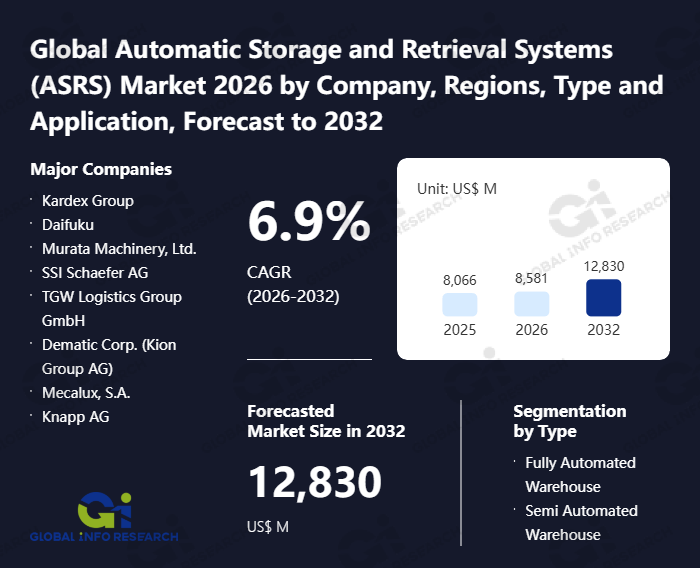 Global Info Research has recently published "Global Automatic Storage and Retrieval Systems (ASRS) Market 2026 by Manufacturers, Regions, Type and Application, Forecast to 2032". This report systematically analyzes the current status, future trends (2021-2032), and competitive landscape of the global Automatic Storage and Retrieval Systems (ASRS) market. It provides a quantitative analysis from the perspectives of type (Fully Automated Warehouse、 Semi Automated Warehouse), application (Distribution Centers、 Automotive、 Electronics & Semiconductors、 Machinery Manufacturing、 Others), regional markets, and major manufacturers (Kardex Group、 Daifuku、 Murata Machinery, Ltd.、 SSI Schaefer AG、 TGW Logistics Group GmbH、 Dematic Corp. (Kion Group AG)、 Mecalux, S.A.、 Knapp AG、 Beumer Group GmbH & Co. KG、 KUKA AG、 Bastian Solutions, LLC、 System Logistics Corporation), comprehensively assessing market opportunities and competitive dynamics.