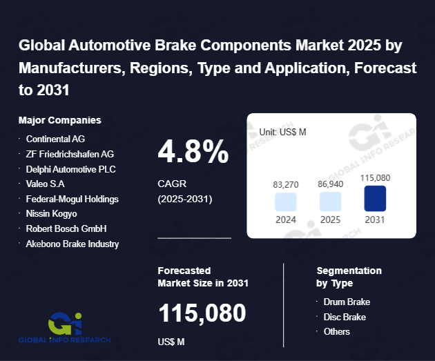 Global Info Research has recently published "Global Automotive Brake Components Market 2026 by Manufacturers, Regions, Type and Application, Forecast to 2032". This report systematically analyzes the global Automotive Brake Components market, providing multi-dimensional insights through type (Drum Brake、 Disc Brake、 Others), application (Passenger Vehicles、 Commercial Vehicles), regional markets, and major manufacturers (Continental AG、 ZF Friedrichshafen AG、 Delphi Automotive PLC、 Valeo S.A、 Federal-Mogul Holdings、 Nissin Kogyo、 Robert Bosch GmbH、 Akebono Brake Industry、 Magneti Marelli S.p.A、 Mando Corporation、 Brembo S.p.A.), assessing the market status, trend evolution, and competitive landscape impact from 2021 to 2032.