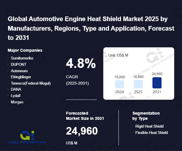 Global Info Research has recently published "Global Automotive Engine Heat Shield Market 2026 by Manufacturers, Regions, Type and Application, Forecast to 2032". This report systematically analyzes the global Automotive Engine Heat Shield market, providing multi-dimensional insights through type (Rigid Heat Shield、 Flexible Heat Shield), application (Passenger Vehicle、 Light Commercial Vehicle、 Heavy Commercial Vehicle), regional markets, and major manufacturers (Sumitomoriko、 DUPONT、 Autoneum、 Elringklinger、 Tenneco(Federal-Mogul)、 DANA、 Lydall、 Morgan、 Tuopu), assessing the market status, trend evolution, and competitive landscape impact from 2021 to 2032.