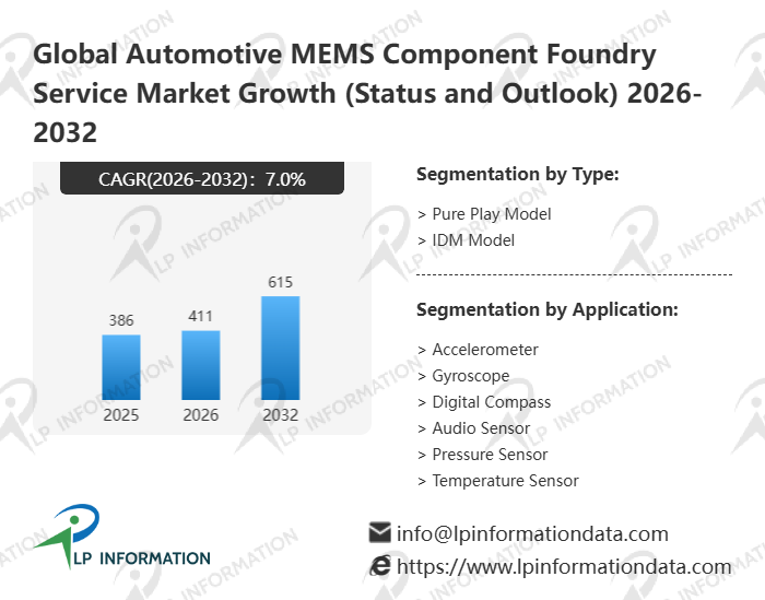 The global Automotive MEMS Component Foundry Service market size is predicted to grow from US$ 386 million in 2025 to US$ 615 million in 2032; it is expected to grow at a CAGR of 7.0% from 2026 to 2032.