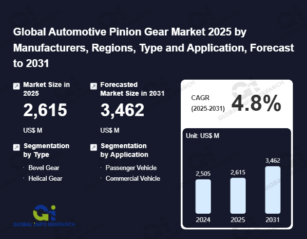 Global Info Research has recently published "Global Automotive Pinion Gear Market 2026 by Manufacturers, Regions, Type and Application, Forecast to 2032". This report systematically analyzes the global Automotive Pinion Gear market, providing multi-dimensional insights through type (Bevel Gear、 Helical Gear), application (Passenger Vehicle、 Commercial Vehicle), regional markets, and major manufacturers (Bharat gears、 SHOWA Corporation、 Renold、 B & R Motion Gears、 Samgong Gears、 Mahindra Gears、 Eaton、 Precipart、 Gear Motions、 BMT International), assessing the market status, trend evolution, and competitive landscape impact from 2021 to 2032.