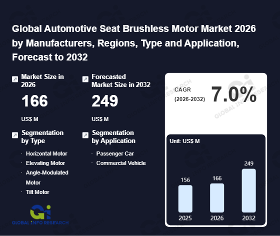 Global Info Research has recently published "Global Automotive Seat Brushless Motor Market 2026 by Manufacturers, Regions, Type and Application, Forecast to 2032". This report systematically analyzes the global Automotive Seat Brushless Motor market, providing multi-dimensional insights through type (Horizontal Motor、 Elevating Motor、 Angle-Modulated Motor、 Tilt Motor), application (Passenger Car、 Commercial Vehicle), regional markets, and major manufacturers (Shenghuabo、 Leggett & Platt、 Denso (ASMO)、 Brose、 Bosch、 Yanfeng、 Johnson Electric、 Keyang Electric Machinery、 Mabuchi、 Mitsuba、 Nidec), assessing the market status, trend evolution, and competitive landscape impact from 2021 to 2032.