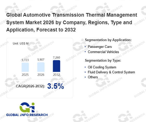 Global Info Research has recently published "Global Automotive Transmission Thermal Management System Market 2026 by Manufacturers, Regions, Type and Application, Forecast to 2032". This report systematically analyzes the global Automotive Transmission Thermal Management System market, providing multi-dimensional insights through type (Oil Cooling System、 Fluid Delivery & Control System、 Others), application (Passenger Cars、 Commercial Vehicles), regional markets, and major manufacturers (MAHLE、 Valeo Group、 Denso、 Zhejiang Yinlun、 MARELLI、 T.RAD Co., Ltd.、 Dana Incorporated、 Tokyo Roki、 Sanhua、 Modine Manufacturing、 UFI Filters、 Hanon Systems), assessing the market status, trend evolution, and competitive landscape impact from 2021 to 2032.