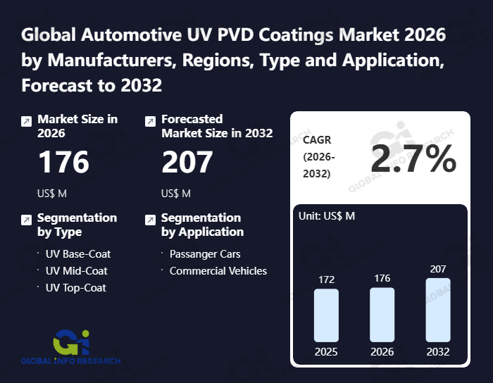 Global Info Research has recently published "Global Automotive UV PVD Coatings Market 2026 by Manufacturers, Regions, Type and Application, Forecast to 2032". This report systematically analyzes the global Automotive UV PVD Coatings market, providing multi-dimensional insights through type (UV Base-Coat、 UV Mid-Coat、 UV Top-Coat), application (Passanger Cars、 Commercial Vehicles), regional markets, and major manufacturers (Fujikura Kasei、 Mankiewicz Gebr、 Sokan、 Redspot、 Hunan Sunshine、 Cashew、 Fujichem Sonneborn (FCS)、 Musashi Paint Group), assessing the market status, trend evolution, and competitive landscape impact from 2021 to 2032.
