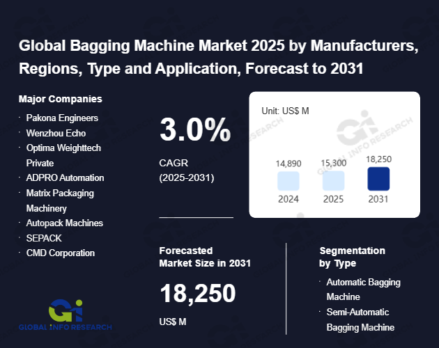 Global Info Research has recently published "Global Bagging Machine Market 2026 by Manufacturers, Regions, Type and Application, Forecast to 2032". This report systematically analyzes the current status, future trends (2021-2032), and competitive landscape of the global Bagging Machine market. It provides a quantitative analysis from the perspectives of type (Automatic Bagging Machine、 Semi-Automatic Bagging Machine), application (Food & Beverage Industry、 Construction Industry、 Pharmaceutical Industry、 Household and Personal Care Industry、 Cosmetic Industry、 Hardware Industry), regional markets, and major manufacturers (Pakona Engineers、 Wenzhou Echo、 Optima Weighttech Private、 ADPRO Automation、 Matrix Packaging Machinery、 Autopack Machines、 SEPACK、 CMD Corporation、 Alligator Automation、 Statec Binder、 Choice Bagging Equipment), comprehensively assessing market opportunities and competitive dynamics.