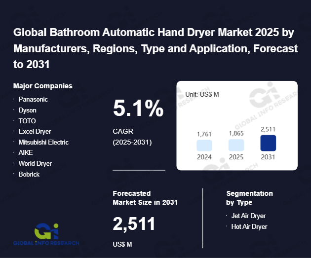 Global Info Research has recently published "Global Bathroom Automatic Hand Dryer Market 2026 by Manufacturers, Regions, Type and Application, Forecast to 2032". This report systematically analyzes the current status, future trends (2021-2032), and competitive landscape of the global Bathroom Automatic Hand Dryer market. It provides a quantitative analysis from the perspectives of type (Jet Air Dryer、 Hot Air Dryer), application (Commercial、 Home、 Others), regional markets, and major manufacturers (Panasonic、 Dyson、 TOTO、 Excel Dryer、 Mitsubishi Electric、 AIKE、 World Dryer、 Bobrick、 Mediclinics、 Jaquar Group、 American Dryer、 DIHOUR、 KOHLER、 Sloan、 MoDun Sanitary Ware), comprehensively assessing market opportunities and competitive dynamics.