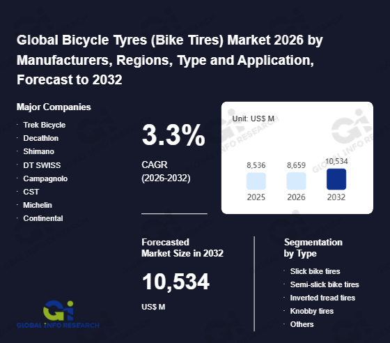 Global Info Research has recently published "Global Bicycle Tyres (Bike Tires) Market 2026 by Manufacturers, Regions, Type and Application, Forecast to 2032". This report systematically analyzes the global Bicycle Tyres (Bike Tires) market, providing multi-dimensional insights through type (Slick bike tires、 Semi-slick bike tires、 Inverted tread tires、 Knobby tires、 Others), application (Road Bike、 Mountain Bike、 Others), regional markets, and major manufacturers (Trek Bicycle、 Decathlon、 Shimano、 DT SWISS、 Campagnolo、 CST、 Michelin、 Continental、 Ralf Bohle GmbH、 Pirelli Cycling、 Kenda Tires、 Hutchinson Cycling、 Specialized、 Zhongce Rubber Group Co., Ltd、 Giant Bicycles), assessing the market status, trend evolution, and competitive landscape impact from 2021 to 2032.
