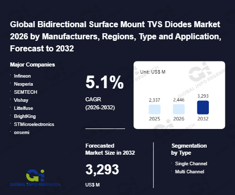 Global Info Research has recently published "Global Bidirectional Surface Mount TVS Diodes Market 2026 by Manufacturers, Regions, Type and Application, Forecast to 2032". This report systematically analyzes the global Bidirectional Surface Mount TVS Diodes market, providing multi-dimensional insights through type (Single Channel、 Multi Channel), application (Automotive、 Industrial、 Military/Aerospace、 Communication、 Computing、 Consumer Electronics、 Others), regional markets, and major manufacturers (Infineon、 Nexperia、 SEMTECH、 Vishay、 Littelfuse、 BrightKing、 STMicroelectronics、 onsemi、 OmniVision、 WAYON、 Diodes Inc.、 Prisemi、 Bourns、 LAN technology、 ANOVA、 MDE、 TOSHIBA、 UN Semiconductor、 PROTEK、 INPAQ、 EIC、 Texas Insutruments、 Rohm、 TDK、 Analog Devices Inc.、 KOA Speer、 KYOCERA AVX、 WeEn Semiconductors、 Panasonic、 Microchip), assessing the market status, trend evolution, and competitive landscape impact from 2021 to 2032.