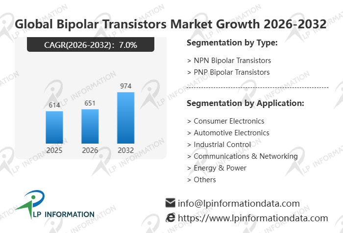 The global Bipolar Transistors market size is predicted to grow from US$ 614 million in 2025 to US$ 974 million in 2032; it is expected to grow at a CAGR of 7.0% from 2026 to 2032.