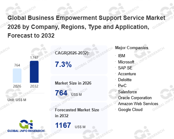 Global Info Research has recently published "Global Business Empowerment Support Service Market 2026 by Manufacturers, Regions, Type and Application, Forecast to 2032". This report systematically analyzes the global Business Empowerment Support Service market, providing multi-dimensional insights through type (Digital Transformation Service、 Digital Marketing Service、 Others), application (Large Enterprise、 Medium-Sized Enterprise、 Small Companies), regional markets, and major manufacturers (IBM、 Microsoft、 SAP SE、 Accenture、 Deloitte、 PwC、 Salesforce、 Oracle Corporation、 Amazon Web Services、 Google Cloud), assessing the market status, trend evolution, and competitive landscape impact from 2021 to 2032.