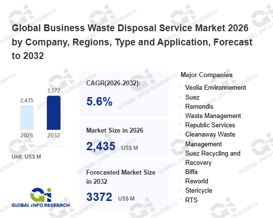 Global Info Research has recently published "Global Business Waste Disposal Service Market 2026 by Manufacturers, Regions, Type and Application, Forecast to 2032". This report systematically analyzes the global Business Waste Disposal Service market, providing multi-dimensional insights through type (Front-end Classification Guide、 Mid-end Transportation、 Back-end Processing and Data Tracking), application (Retail and Wholesale、 Catering、 Hotel and Accommodation、 Office and Business Services、 Medical and Health Industry、 Other), regional markets, and major manufacturers (Veolia Environnement、 Suez、 Remondis、 Waste Management、 Republic Services、 Cleanaway Waste Management、 Suez Recycling and Recovery、 Biffa、 Reworld、 Stericycle、 RTS、 Veolia、 Vogel Disposal、 Waste Connections、 TDS、 Business Waste、 Rumpke、 EDCO、 Devon Contract Waste、 Junkwize、 Groot、 Richmond Waste、 Instant Waste Management、 Rubicon、 Eagle Disposal), assessing the market status, trend evolution, and competitive landscape impact from 2021 to 2032.