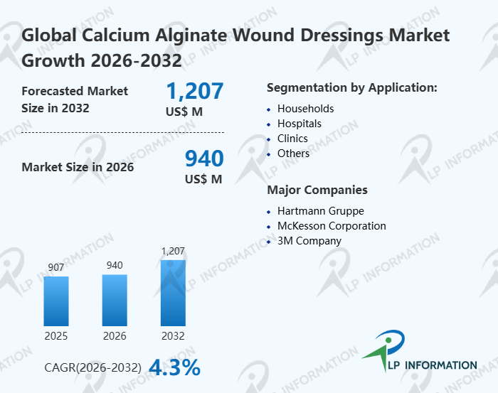 The global Calcium Alginate Wound Dressings market size is predicted to grow from US$ 907 million in 2025 to US$ 1207 million in 2032; it is expected to grow at a CAGR of 4.3% from 2026 to 2032.