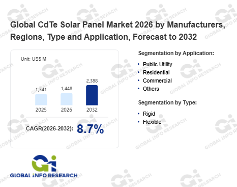 Global Info Research has recently published "Global CdTe Solar Panel Market 2026 by Manufacturers, Regions, Type and Application, Forecast to 2032". This report systematically analyzes the global CdTe Solar Panel market, providing multi-dimensional insights through type (Rigid、 Flexible), application (Public Utility、 Residential、 Commercial、 Others), regional markets, and major manufacturers (First Solar、 Hangzhou Advanced Solar Power、 Antec Solar、 Calyxo、 Chengdu CNBM Optoelectronic Materials、 Reel Solar、 D2solar、 Dmsolar、 Toledo Solar、 Willard and Kelsey (WK) Solar、 NREL、 CTF Solar GmbH), assessing the market status, trend evolution, and competitive landscape impact from 2021 to 2032.