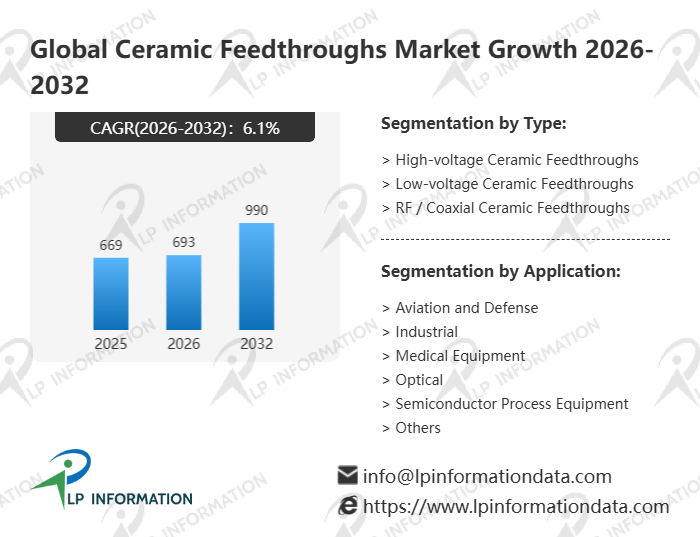 The global Ceramic Feedthroughs market size is predicted to grow from US$ 669 million in 2025 to US$ 990 million in 2032; it is expected to grow at a CAGR of 6.1% from 2026 to 2032.