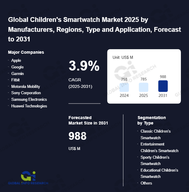 Global Info Research has recently published "Global Children's Smartwatch Market 2026 by Manufacturers, Regions, Type and Application, Forecast to 2032". This report systematically analyzes the global Children's Smartwatch market, providing multi-dimensional insights through type (Classic Children's Smartwatch、 Entertainment Children's Smartwatch、 Sporty Children's Smartwatch、 Educational Children's Smartwatch、 Others), application (Household、 School、 Outdoor Activities、 Others), regional markets, and major manufacturers (Apple、 Google、 Garmin、 Fitbit、 Motorola Mobility、 Sony Corporation、 Samsung Electronics、 Huawei Technologies、 Pebble、 Nike), assessing the market status, trend evolution, and competitive landscape impact from 2021 to 2032.
