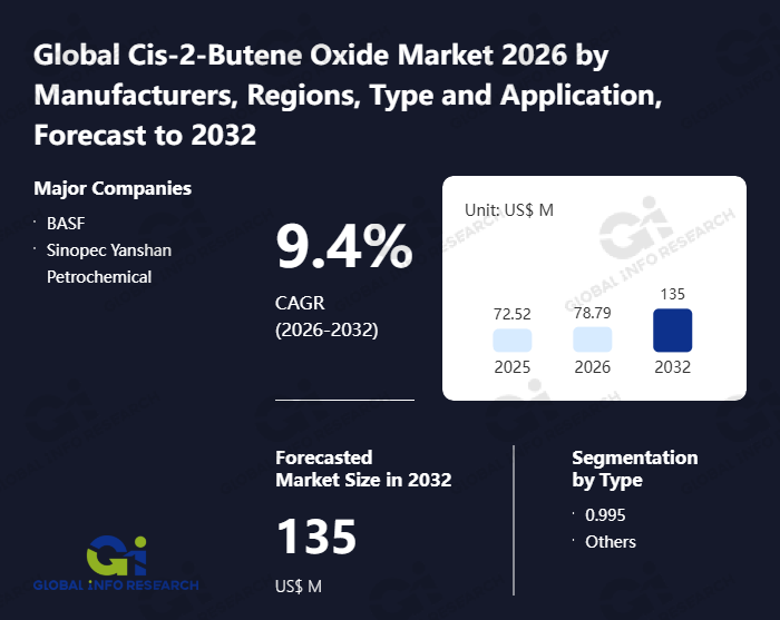 Global Info Research has recently published "Global Cis-2-Butene Oxide Market 2026 by Manufacturers, Regions, Type and Application, Forecast to 2032". This report systematically analyzes the current status, future trends (2021-2032), and competitive landscape of the global Cis-2-Butene Oxide market. It provides a quantitative analysis from the perspectives of type (0.995、 Others), application (Chemical Intermediate、 Stabilizer for Industrial Solvents、 Nonionic Surfactant、 Others), regional markets, and major manufacturers (BASF、 Sinopec Yanshan Petrochemical), comprehensively assessing market opportunities and competitive dynamics.