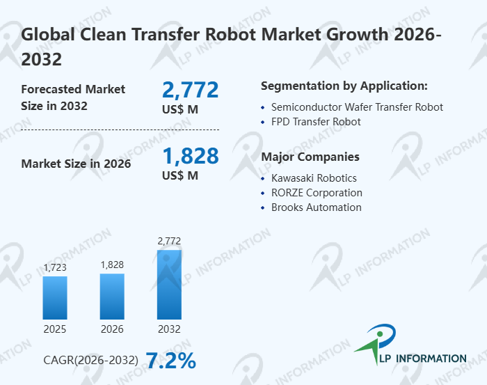 The global Clean Transfer Robot market size is predicted to grow from US$ 1723 million in 2025 to US$ 2772 million in 2032; it is expected to grow at a CAGR of 7.2% from 2026 to 2032.