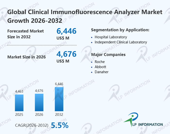 The global Clinical Immunofluorescence Analyzer market size is predicted to grow from US$ 4463 million in 2025 to US$ 6446 million in 2032; it is expected to grow at a CAGR of 5.5% from 2026 to 2032.