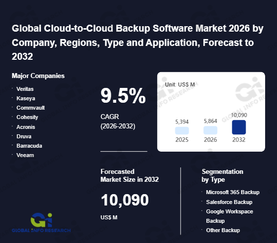 Global Info Research has recently published "Global Cloud-to-Cloud Backup Software Market 2026 by Manufacturers, Regions, Type and Application, Forecast to 2032". This report systematically analyzes the global Cloud-to-Cloud Backup Software market, providing multi-dimensional insights through type (Microsoft 365 Backup、 Salesforce Backup、 Google Workspace Backup、 Other Backup), application (Large Enterprises、 SMEs), regional markets, and major manufacturers (Veritas、 Kaseya、 Commvault、 Cohesity、 Acronis、 Druva、 Barracuda、 Veeam、 Own Company、 AvePoint、 N‑able Cove、 Arcserve、 HPE Zerto、 Keepit、 Vembu (BDRSuite)、 Rewind、 Asigra、 Dropsuite、 Skyvia、 Opentext (CloudAlly)), assessing the market status, trend evolution, and competitive landscape impact from 2021 to 2032.