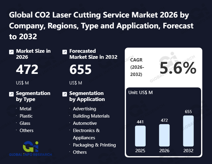 Global Info Research has recently published "Global CO2 Laser Cutting Service Market 2026 by Manufacturers, Regions, Type and Application, Forecast to 2032". This report systematically analyzes the current status, future trends (2021-2032), and competitive landscape of the global CO2 Laser Cutting Service market. It provides a quantitative analysis from the perspectives of type (Metal、 Plastic、 Glass、 Others), application (Advertising、 Building Materials、 Automotive、 Electronics & Appliances、 Packaging & Printing、 Others), regional markets, and major manufacturers (Accurate Laser、 Salamander Fabrications、 Xometry、 Smucker Laser、 The Laser Cutting Co.、 Brocott UK、 MC Laser Labs、 Fractory、 Carolina Laser Company、 Thinklaser、 Artisan Model Makers、 Speed Laser Studio、 Western Saw Inc.、 Hammerspace Workshop、 Dassault Systèmes、 Eco Laser、 Design Concepts Chi、 Swordfish Works、 Krintech、 Zone Creations), comprehensively assessing market opportunities and competitive dynamics.