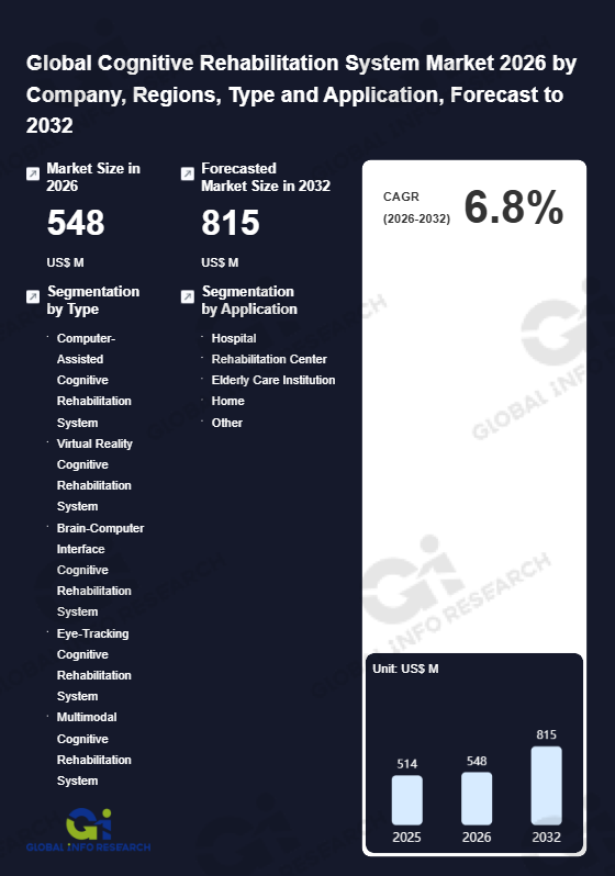 Global Info Research has recently published "Global Cognitive Rehabilitation System Market 2026 by Manufacturers, Regions, Type and Application, Forecast to 2032". This report systematically analyzes the global Cognitive Rehabilitation System market, providing multi-dimensional insights through type (Computer-Assisted Cognitive Rehabilitation System、 Virtual Reality Cognitive Rehabilitation System、 Brain-Computer Interface Cognitive Rehabilitation System、 Eye-Tracking Cognitive Rehabilitation System、 Multimodal Cognitive Rehabilitation System), application (Hospital、 Rehabilitation Center、 Elderly Care Institution、 Home、 Other), regional markets, and major manufacturers (Akili Interactive Labs, Inc.、 MedRhythms, Inc.、 MindMaze SA、 Neofect Co., Ltd.、 CogniFit, Inc.、 Khymeia、 Zhejiang BrainCo Technology Co., Ltd.、 Shandong Haitian Intelligent Engineering Co., Ltd.、 Henan Xiangyu Medical Equipment Co., Ltd.、 Hangzhou Xuzhishi Technology Co., Ltd.、 Nanjing Vishee Medical Technology Co., Ltd.、 Guangzhou Yikang Medical Equipment Industrial Co., Ltd.、 Changzhou Qianjing Rehabilitation Co., Ltd.、 Hangzhou Jizhi Medical Technology Co., Ltd.), assessing the market status, trend evolution, and competitive landscape impact from 2021 to 2032.