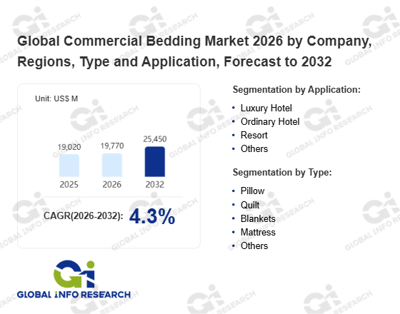 Global Info Research has recently published "Global Commercial Bedding Market 2026 by Manufacturers, Regions, Type and Application, Forecast to 2032". This report systematically analyzes the global Commercial Bedding market, providing multi-dimensional insights through type (Pillow、 Quilt、 Blankets、 Mattress、 Others), application (Luxury Hotel、 Ordinary Hotel、 Resort、 Others), regional markets, and major manufacturers (Serta Simmons Bedding、 Tempur Sealy International、 Sleep Number、 Sleep Innovations、 Ashley、 Corsicana、 Therapedic International、 Pikolin、 Airweave、 Mlily Home Technology、 Vita Talalay、 Sleemon、 Suibao Group、 Airland、 Flou、 casalis、 KOKET Love Happens、 Varaschin、 ITALIANELEMENTS、 Muranti、 Maison Lévy、 Hypnos Limited、 Elite Sa), assessing the market status, trend evolution, and competitive landscape impact from 2021 to 2032.