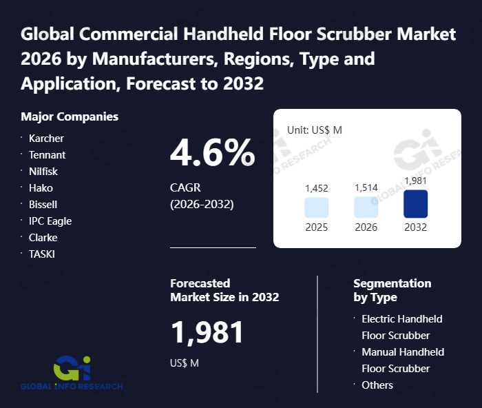 Global Info Research has recently published "Global Commercial Handheld Floor Scrubber Market 2026 by Manufacturers, Regions, Type and Application, Forecast to 2032". This report systematically analyzes the global Commercial Handheld Floor Scrubber market, providing multi-dimensional insights through type (Electric Handheld Floor Scrubber、 Manual Handheld Floor Scrubber、 Others), application (Hotel、 Dining Room、 Office Building、 Shopping Mall、 Others), regional markets, and major manufacturers (Karcher、 Tennant、 Nilfisk、 Hako、 Bissell、 IPC Eagle、 Clarke、 TASKI、 Powr-Flite、 Hoover Commercial、 Xiazhi Technology), assessing the market status, trend evolution, and competitive landscape impact from 2021 to 2032.