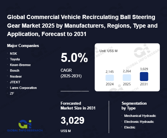 Global Info Research has recently published "Global Commercial Vehicle Recirculating Ball Steering Gear Market 2026 by Manufacturers, Regions, Type and Application, Forecast to 2032". This report systematically analyzes the global Commercial Vehicle Recirculating Ball Steering Gear market, providing multi-dimensional insights through type (Mechanical Hydraulic、 Electronic Hydraulic、 Electric), application (City Bus、 Heavy Truck、 Long-Distance Bus、 Others), regional markets, and major manufacturers (NSK、 Toyota、 Knorr-Bremse、 Bosch、 Nexteer、 JTEKT、 Lares Corporation、 ZF、 Zhejiang Shibao、 Yubei Steering System ( Xinxiang)、 Casacrotti、 Henglong Group、 Hubei Tri-Ring Motor Steering Gear), assessing the market status, trend evolution, and competitive landscape impact from 2021 to 2032.
